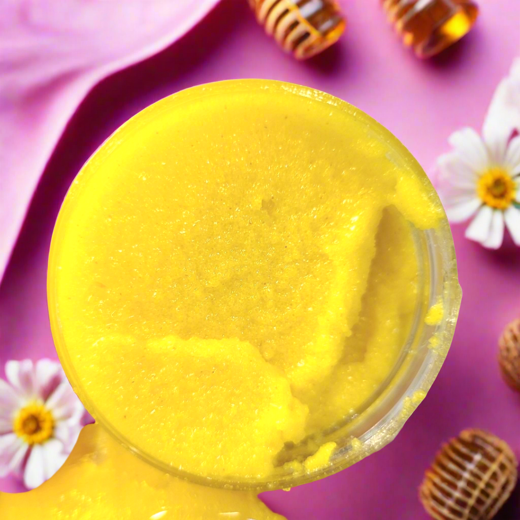 RAW SUGAR CANE, BUTTER MIXTURE, TURMERIC, TEA TREE EO, LEMON EO, AND A NATURAL OIL & EXTRACT BLEND.